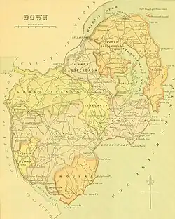 County Down takes its name from dún, the Irish word for dun or fort, which is a common root in Gaelic place names (such as Dundee, Dunfermline and Dumbarton in Scotland and Donegal and Dundalk in the Republic of Ireland).[12] The fort in question was in the historic town of Downpatrick, originally known as Dún Lethglaise ("fort of the green side" or "fort of the two broken fetters").[13][14] Another word for the county is "Downshire".[15]
