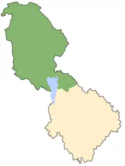 Geographically, the county is almost evenly divided by Lough Allen (itself part of the River Shannon) and the River Shannon upstream from Lough Allen. While this boundary within the county runs from south to north, separating east from west in its immediate vicinity, the county extends much further north to the west of this line and much further south to the east, and the two parts of the county are commonly known as North Leitrim and South Leitrim, respectively. Uniquely among Irish counties, there is no way to cross from North Leitrim to South Leitrim as defined above (or vice versa) by road without leaving its boundaries. An alternative boundary between North and South Leitrim follows Sliabh an Iarainn east from Lough Allen rather than the River Shannon upstream from it, separating the baronies of Drumahaire to the north and Leitrim and Carrigallen to the south, as in the map in this section, although this boundary is crossed by a few roads including the regional R207 road. North Leitrim under at least one definition is slightly larger than the south, comprising 51% of County Leitrim's land area. However, South Leitrim, with towns such as Carrick-on-Shannon, Ballinamore and Drumshambo, is significantly more populous, containing approximately 65% of the county's population as of 2016.[14]