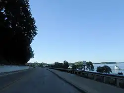 Iowa 99 began at an interchange with US 34 in downtown Burlington, at the foot of the. US 34 is an elevated highway that connects to the Great River Bridge and Iowa 99 passed beneath along Bluff Road. Iowa 99 is joined by the Great River Road as well. To the east of the highway lies a park and municipal marina, both of which abut the Mississippi River. To the west, a bluff rises above the roadway. North of Burlington, the highway followed the base of the tree-lined bluffs to the west; it served as a divider to the farm fields occupying the river bottoms to the east. The road passed through the unincorporated community of Kingston.[2][3]