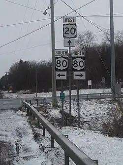 New York State Route 80 (NY 80) is a 127.32-mile-long (204.90 km) west–east New York State Route located within Onondaga, Madison, Chenango, Otsego, Herkimer, and Montgomery counties in New York. Its western terminus is located at a junction with NY 175 in the city of Syracuse in Onondaga County, from which it actually runs in a north–south direction for 20 miles (32 km). The eastern terminus is located at a junction with NY 5 in the village of Nelliston in Montgomery County. The route is signed north–south from U.S. Route 20 (US 20) north to NY 5.