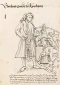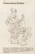 - Conrad of Kirchberg: Konrad is shown on the miniature 24r of the Codex Manesse as a knight (Graue Chunrat vo Kilchberg) who is giving his beloved a poem on horseback. 22 stanzas have survived, divided into three summer and three winter songs, which are reminiscent of Neidhart and Tannhäuser in terms of motif and form.[7] The historical person is uncertain; it is either Konrad (documented between 1255 and 1268) or his son of the same name (documented between 1286 and 1315).[7]