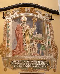 - Bruno of Kirchberg, Bishop of Brixen: Bruno's father was most likely Conrad I, Count of Kirchberg. The tradition from Brixen is likely to apply, since both Bruno's brothers Conrad II and Eberhard III of Kirchberg named their firstborn Conrad. According to the necrologists from Stams and Brixen, his mother's name was Bertha. She came from the family of the House of Gorizia. It could be the daughter of Engelbert III, Count of Gorizia (unnamed in 1206 (Strasbourg/Carinthia) in the Gurk historical sources) and Matilda of Andechs. Mathilde's sister was also called Bertha (Abbess of Gerbstett). This would make Bruno's mother a sister of Meinhard III of Gorizia. Presumably through this connection with the people of Gorizia, Bruno came to the cathedral school in Brixen as a child; on the occasion of a certification in Lyon (5 July 1274) he thanks for the education there. Bruno was originally for the bishopric in Trent, which he had to renounce after papal intervention. From 1250 until his death on 24 August 1288 he was bishop of Brixen. The founding of the city of Bruneck and the construction or expansion of Bruneck Castle can be traced back to him. The city's name is variously derived from his first name.[8] He is also a co-founder of the Cistercian Abbey of Stams in the Inn Valley.[9]