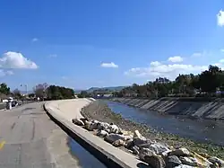 The lowermost reach of San Juan Creek begins after it crosses underneath Interstate 5. After passing beneath the interstate, it is abruptly diverted into a trapezoidal flood control channel, with concrete levees and an earthen riverbed. The creek flows southwest, arcing gradually south, and very soon receives the underground discharge of El Horno Creek[9] on the right bank. A few hundred yards past El Horno, San Juan Creek receives its largest tributary, Trabuco Creek, on the right bank. Trabuco Creek begins in the northeastern corner of the watershed and drains most of the watershed's north half. It flows primarily west then south-southwest, through a valley that is generally more developed than that of the mainstem. For much of its lower third, it winds alongside Interstate 5. At river mile 4 (river kilometer 6.4) it receives its major tributary, Oso Creek, on its right bank. In its final course, it flows into a south-flowing flood control channel that meets San Juan Creek inside San Juan Capistrano.[1][3][4][8]