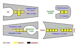There are variations in the court cairn layout in both Ireland and Scotland. Most examples have a single courtyard connected by one burial tomb or a courtyard connected to two burial tombs, located on opposite ends of the court area. In Ireland, there are also instances of layouts with dual tombs, each with its own courtyard, but both sharing a common burial mound. The court cairn is also found in Western Scotland. The similar layout of tombs found in Ireland and Scotland and the close geographical location of these tombs, separated by the narrow Irish Channel, indicates that these populations moved back and forth on a regular basis between the two countries.[3][4]