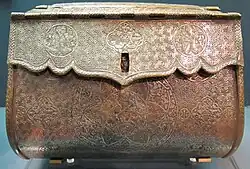 The "Courtauld bag" is a medieval handbag made of brass and inlaid with gold, silver, and an unidentified black material. Tentatively attributed to Mosul, sometime between 1300 and 1330 when it was ruled by the Ilkhanate, it is believed to be the oldest surviving handbag in the world.