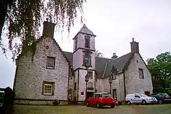 John Cowane's brother, Alexander, acted as his executor and signed the hospital's Deed of Foundation on 13 February 1637.[7] The land, sited adjacent to the Church of the Holy Rude in a prestigious part of the town, was transferred to the Town Council, and plans for the new building were commissioned from the royal master-mason John Mylne. As with Mylne's other architectural work, the design shows contemporary Dutch influences, notably the form of the bell tower and crow-step gables. In a niche on the tower is a statue of John Cowane, sculpted by Mylne and William Ayton.[1] The statue, locally known as "Auld Staneybreeks" (old stone-trousers), is said to come to life and dance in the courtyard at Hogmanay (New Year).[8]