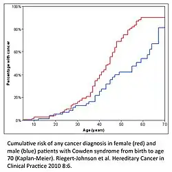 | Kaplan–Meier plot showing cumulative risk for the development of cancer in males (blue lower curve) and females (red upper curve) with Cowden syndrome from birth to age 70. | |