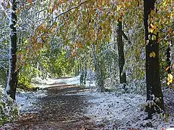For 17 years the Chiltern Sculpture Trail was in Cowleaze Wood. The trail was created in May 1990,[1] as a joint initiative between the Chiltern Sculpture Trust and the Forestry Commission,[2] who had been placing sculpture in woodlands under their management since the 1970s.[11] The 2-mile trail featured the work of a range of artists working with different media, with pieces being commissioned and produced specifically for the woodland setting.[12][13] Many of the pieces were hidden and blended with the landscape. Richard Mabey, writing in the Independent on Sunday, commented: "All along the trail, serendipitously windthrown logs, dens, a polythene bag wrapped round a branch in the shape of a squirrel, make you wonder whether you are looking at a deliberate work or a natural happening."[11] Sculptures that appeared as part of the trail included a giant picnic table by Robert Jakes and a metal "fish tree" by Paul Amey.[11]