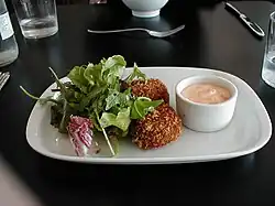 A crab cake is a variety of fishcake popular in the United States. It is composed of crab meat and various other ingredients, such as bread crumbs, mayonnaise, mustard (typically prepared mustard, but sometimes mustard powder), eggs, and seasonings. It is then sautéed, baked, grilled, deep fried, or broiled. Crab cakes are traditionally associated with the Chesapeake Bay, in the state of Maryland.[1][2] Although the earliest use of the term "crab cake" is commonly believed to date to Crosby Gaige's 1939 publication New York World's Fair Cook Book in which they are described as "Baltimore crab cakes,"[3] earlier usages can be found such as in Thomas J. Murrey's book Cookery with a Chafing Dish published in 1891.[4]