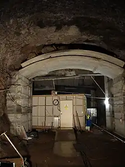 Railways were built for access and for the removal of waste soil. The largest cavern was 7 metres high, 10 metres wide and 30 metres long. Prestressed concrete was used to line the caverns. Officers based in the estate house would come down stairs into the tunnels, while others were to enter through the access tunnels. Construction came to a sudden halt in 1944 as the threat of invasion receded, even though work on the bunkers was nearly complete. The weekend before the military left the estate, fire broke out and the Cracroft Wilson House was burnt to the ground.