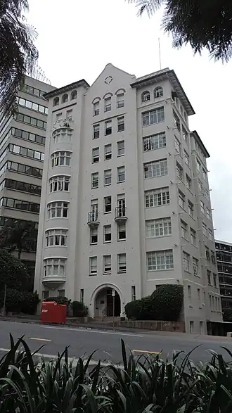 Professional suites occupy the ground and sub-floors, with the remaining levels providing residential accommodation. Apart from the sixth level, which has always accommodated two apartments, each of the residential levels originally contained one spacious flat with central arrival hall, servants' rooms in the back western corner and family living in the L-shape. Most of the flats have been subdivided since, with apartments currently numbering twelve.[1]