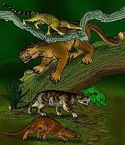 | Various creodonts of the Eocene of Colorado, United States. From top: Tritemnodon, Patriofelis, Machaeroides, and Sinopa | |
