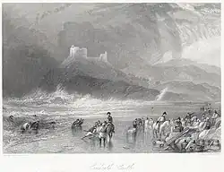 Criccieth is the subject of four colour studies by the Romantic artist J. M. W. Turner, as well as one full watercolour depicting salvage on Criccieth beach with the castle in the background. The sketches were undertaken when Turner visited the coast of North Wales in 1798, and the watercolour dates from 1835. Turner took some artistic licence with the latter, depicting the cliffs higher than in reality and depicting the sea in an unlikely position according to the usual pattern of Criccieth's tides.[20]