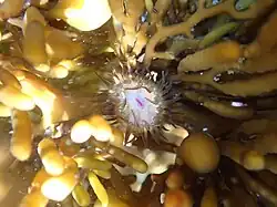 It is found living in colonies on the stem of large seaweed and kelp species in the low tidal zone.[2] It can also live in deep tidal pools where seaweed is present.[3]
