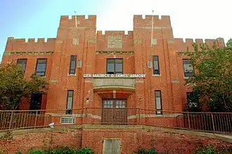 The Crisfield Armory is a historic National Guard armory located at Crisfield, Somerset County, Maryland, United States. It is two stories tall with a full basement, emulates a medieval fortification, and was built in 1927. Attached to the rear of this two-story main block is a narrower one-story drill hall. The front features a central section flanked by two, three-story tall towers. The State Seal of Maryland appears in a large square stone panel at the roofline, surmounted by three crenelles with stone caps.[2] It is located within the boundaries of the Crisfield Historic District.
