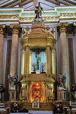The Cristo Negro of Otatitlán is in the parish church of the town.[17] There are two stories of the origin of this particular image. One states the Spanish king Philip II had the three Black Christ images commissioned, which then went on to their current locations.[18] Another story says that the image was found on the Day of the Cross by an indigenous person at the foot of a tree in the village of Puctlanzingo, which was then claimed by the Mazatecos of the region. Later it was moved on the Papaloapan River on a raft to its current location.[17][18] During the Cristero War in the 1930s, the image was taken by men allied with then governor of Veracruz, Adalberto Tejada, who tried unsuccessfully to burn it. Instead it was decapitated. The headless image returned to Otatitlán and a replacement was made. In 1950, the original head was found and returned, with the replacement head now kept in a glass case.[17][19] The devotion to this image is a syncretism. It is not unusual for there to be a mass followed by a ritual cleansing by a local “brujo” (roughly witch doctor).[17] The major feast day for this image is May 3, Day of the Cross, with events beginnings on April 28 and extending to May 7. The event can attract up to 150,000 people from Veracruz and other parts of Mexico.[18]