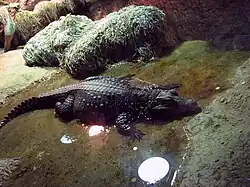 | Cuban crocodile (Crocodylus rhombifer) | Found only in the Zapata Swamp and Isle of Youth of Cuba | It is a small but extremely aggressive species of crocodile that prefers freshwater swamps.[51] The coloration is vibrant even as adults and the scales have a "pebbled" appearance. It is a relatively terrestrial species with agile locomotion on land, and sometimes displays terrestrial hunting. The snout is broad with a thick upper-jaw and large teeth. The unique characteristics and fossil record indicates a rather specialized diet in the past, preying on megafauna such as the giant sloth. This species sometimes displays pack-hunting behaviour, which might have been the key to hunting large species in the past, despite its small size.[52] Today most prey are small to medium sized vertebrates. It is Critically Endangered, and the remaining wild population is under threat of hybridization.[53] | |