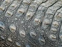 The skin of crocodilians is clad in non-overlapping scales known as scutes that are covered by beta-keratin.[77] Many of the scutes are strengthened by bony plates known as osteoderms. Scutes are most numerous on the back and neck of the animal. The belly and underside of the tail have rows of broad, flat, square-shaped scales.[38] Between crocodilian scales are hinge areas that consist mainly of alpha-keratin.[78] Underneath the surface, the dermis is thick with collagen.[79] Both the head and jaws lack scales and are instead covered in tight, keratinised skin that is fused directly to the bones of the skull and which, over time, develop a pattern of cracks as the skull develops.[80] The skin on the neck and sides is loose.[38][81] The scutes contain blood vessels and may act to absorb or release heat during thermoregulation.[38] Research also suggests alkaline ions released into the blood from the calcium and magnesium in the dermal bones act as a buffer during prolonged submersion when increasing levels of carbon dioxide would otherwise cause acidosis.[82]
