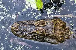 The eyes, ears and nostrils of crocodilians are at the top of the head; this placement allows them to stalk their prey with most of their bodies underwater.[48] When in bright light, the pupils of a crocodilian contract into narrow slits, whereas in darkness they become large circles, as is typical for animals that hunt at night. Crocodilians' eyes have a tapetum lucidum that enhances vision in low light. When the animal completely submerges, the nictitating membranes cover its eyes. Glands on the nictitating membrane secrete a salty lubricant that keeps the eye clean. When a crocodilian leaves the water and dries off, this substance is visible as "tears".[40] While eyesight in air is fairly good, it is significantly weakened underwater.[65] Crocodilians appear to have undergone a "nocturnal bottleneck" early in their history, during which their eyes lost traits like sclerotic rings, an annular pad of the lens and coloured cone oil droplets, giving them dichromatic vision (red-green colourblindness). Since then, some crocodilians appear to have re-evolved full-colour vision.[66][67][68]