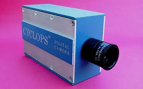 The Cromemco Cyclops, introduced in 1975 by Cromemco, was the first commercial all-digital camera using a digital metal–oxide–semiconductor (MOS) image sensor.[1] It was also the first digital camera to be interfaced to a microcomputer. The digital sensor for the camera was a modified 1 kb dynamic RAM (DRAM) memory chip that offered a resolution of 32 × 32 pixels (0.001 megapixels).[1]