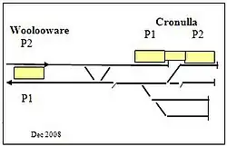 The Cronulla line was constructed as an electrified railway line, and was the first major use of a miniaturised relay locking system using electrical relays for electric light signalling for sections of the line (known as the electro- pneumatic system).[3] Under the Rail Clearways Program, the two remaining single track sections of the Cronulla line were duplicated in 2010.[9][10] As a result, train stabling west of Cronulla was replaced by stabling sidings opposite platform 2. Cronulla has the second longest platform in New South Wales, after Albury.[8]