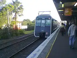 The Sutherland-Cronulla line was constructed from 1936 and completed in 1939, under the NSW premiership of the conservative Sir Bertram Stevens. In 1936 the NSW Parliament authorised expenditure of A£300,000 to construct the Sutherland to Cronulla railway line, with the men employed to receive award wages "in pursuance of the Cabinet's policy of replacing unemployment relief works by works that will provide a better return for the expenditure of public money, and at the same time create improved conditions of employment."[4] A federal loan for "state works" including "speeding up of the construction of the Sutherland-Cronulla line" was granted to the NSW government in November 1938.[5] The Cronulla line replaced the steam tramway.[3] A single track railway line replaced the tram service, opening on 16 December 1939.[6][7]