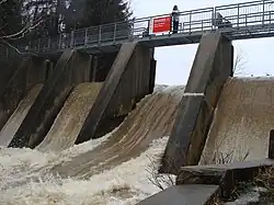 Crooks Hollow Dam with all 4 spillways in action on March 14, 2010. On this day, HCA's upstream measuring station at Christie Conservation Area recorded 67.5 mm of rain.[1] | |