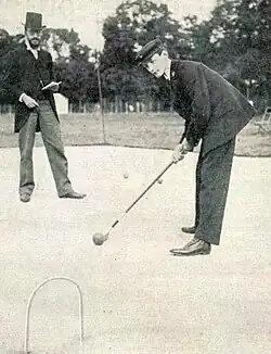 This was the only Olympiad where croquet was part of the official programme, though there was the variant called roque at the 1904 Summer Olympics.[1] All events which were restricted to amateurs, open to all nations, open to all competitors, and without handicapping, are now regarded as Olympic events (except for ballooning).[2]: 12–13 Although croquet satisfied three criteria, it had been thought to have an entrant from Belgium, Marcel Haëntjens,[2]: 27 (Haëntjens is a Flemish name) and thus have been an international competition. Haëntjens is now known to have been from France,[3] as were the other croquet players. Only one paying spectator attended the event.[4]