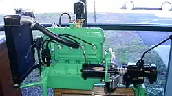 The Crosley car's chassis had an 80-inch (2,032 mm) wheelbase and used beam axles with leaf-springs (half-elliptic springs in front, and quarter-elliptic springs in the rear). Under the hood, a 4 US gal (15 L) gravity-fed fuel-tank mounted above the motor made it possible for the car to operate without a fuel pump.[10] The engine was a small, air-cooled Waukesha two-cylinder boxer, much like that of the Citroen 2CV,[9] and had a fan as an integral part of the flywheel. The engine was connected to a three-speed transmission that provided power directly via a torque tube to the rear axle, eliminating the need for joints. This arrangement was judged unreliable, and conventional universal joints were fitted starting in 1941.[11]