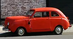 Introduced as a steel roof, two-door, two-box fastback sedan and a fixed profile convertible (with fixed side windows and frames, like the Citroën 2CV and the 2007 Fiat 500),[38] the car also became available as a pick-up – initially with a pickup-box with the same rounded rear-side panels as the sedan (roundside pickup).[34] In late 1947 a station wagon was added, as a 1948 model, as well as a panel van – a derivative of the wagon, but with a different floorpan to yield a flatter floor. The panel delivery also had a side opening rear door, as opposed to the Station wagon's above/below split tailgate, while the basic sedan had no outside trunk lid – access to the luggage space was only from inside the car.