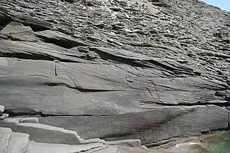 Tabular cross-bedding is formed mainly by migration of large-scale, straight-crested ripples and dunes. It forms during lower-flow regimes. Individual beds range in thickness from a few tens of centimeters to a meter or more, but bed thickness down to 10 centimeters has been observed.[6] Where the set height is less than 6 centimeters and the cross-stratification layers are only a few millimeters thick, the term cross-lamination is used, rather than cross-bedding. Cross-bed sets occur typically in granular sediments, especially sandstone, and indicate that sediments were deposited as ripples or dunes, which advanced due to a water or air current.[7]
