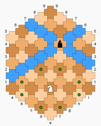 The diagram shows the starting setup. Special rank and diagonal paths determine how pieces move, as described below. Check, checkmate, and stalemate are as in standard chess. However a pawn has no initial two-step option, and a rook can make a one-step diagonal move.[a]