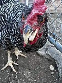 Crossed beak has been reported in at least 12 chicken strains worldwide, including commercial strains like leghorn (Landauer, 1938) and Rhode Island Red (Landauer, 1956), as well as native breeds like the Appenzeller Barthuhn, Schweizer (Joller et al., 2018), Chinese silk chicken (Bai et al., 2014, 2016), Beijing-You (Bai et al., 2018a), and Huiyang bearded chicken (Hong et al., 2019), with frequencies ranged from 0.2 to 7.4%. The deformity is present in around 30% of 114 Chinese native chicken strains.[1]