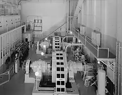 When the generator building first went into operation, it housed two Westinghouse horizontal generators originally rated at 6,600 volts, operating at 225 rpm and producing 3 phase 60 cycle AC. They were driven by turbines. The voltage was stepped up to 100,000 volts using three delta-connected oil-cooled transformers of 3,000 kilowatt capacity. These were regulated with oil switches, and the transformers and switch gear were housed in the south end of the generator building.[14]