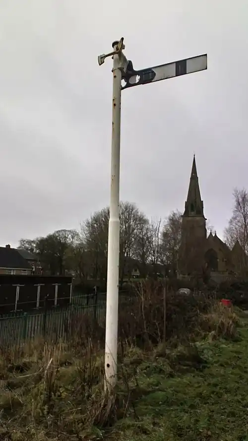 ![]() Signal post still in situ near Crown Street Halt, the Silverdale Church can be seen behind it. | |||||