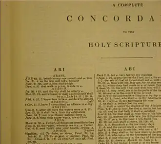 A Complete Concordance to the Holy Scriptures, generally known as Cruden's Concordance, is a concordance of the King James Bible (KJV) that was singlehandedly created by Alexander Cruden (1699–1770). The Concordance was first published in 1737 and has not been out of print since then. Two editions of the Concordance appeared during his lifetime, 1761 and 1769. (Reference 1955 edition)