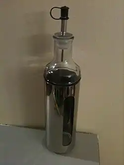 A cruet (/ˈkruːɪt/), also called a caster,[1] is a small flat-bottomed vessel with a narrow neck. Cruets often have a lip or spout and may also have a handle. Unlike a small carafe, a cruet has a stopper or lid. Cruets are normally made of glass, ceramic, stainless steel, or copper.
