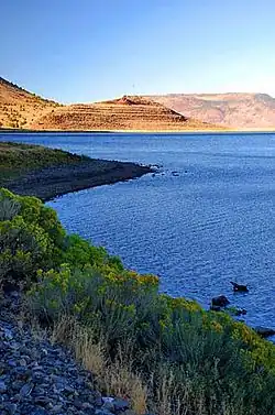 Crump Lake is located 4.5 miles (7.2 km) north of the unincorporated community of Adel, Oregon at the southern end of the Warner Valley in south-central Oregon.[1][2] The valley is approximately 60 miles (97 km) long and 8 miles (13 km) wide. Most of the valley is in Lake County, however the north end of the valley extends about 10 miles (16 km) into Harney County. It is an alluvial basin containing numerous lakes, remnants of a single great lake that covered the valley floor up to 200 feet (61 m) deep during the Pleistocene epoch. Today, steep cliffs rise above a chain of endorheic lakes including Crump Lake, known collectively as Warner Lakes. The valley has two regions commonly referred to as South Warner Valley and North Warner Valley. The two areas transition between Crump Lake in the south and Hart Lake to the north at a point where the valley narrows to about 5 miles (8.0 km) in width.[3][4][5][6]