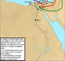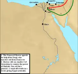 In 1163, King Amalric went to invade Egypt, claiming that the Fatimids had not paid the yearly tribute that had begun during the reign of King Baldwin III. The vizier, Dirgham, who had recently overthrown the vizier Shawar, marched out to meet Amalric at Pelusium, but was defeated and forced to retreat to Bilbeis. The Egyptians then opened up the Nile dams and let the river flood, hoping to prevent Amalric from invading any further, thus he returned home.[4] However, Dirgham preferred to negotiate with Amalric, offering him a peace treaty guaranteed by the surrender of hostages, and the payment of an annual tribute.[3] Meanwhile, Nur ad-Din agreed to support Shawar who offered to hand over one third of the annual land tax (kharāj) revenue to Nur al-Din. The latter manoeuvred to attract the Crusaders' attention away from the expeditionary force, as his general Shirkuh accompanied by his nephew, Saladin, crossed the lands of the Kingdom of Jerusalem to enter Egypt.[3]