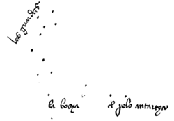 Venetian navigator Alvise Cadamosto in the 15th century made note of what was probably the Southern Cross on exiting the Gambia River in 1455, calling it the carro dell'ostro ("southern chariot"). However, Cadamosto's accompanying diagram was inaccurate.[7][8] Historians generally credit João Faras[a] for being the first European to depict it correctly. Faras sketched and described the constellation (calling it "las guardas") in a letter written on the beaches of Brazil on 1 May 1500 to the Portuguese monarch.[9][10]