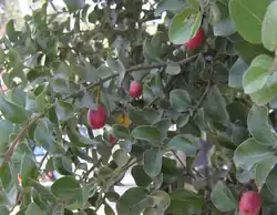 It has very scented leaves. The fruit is a red berry and is edible. It blooms from November to January (southern hemisphere). The wood is very hard and resistant to moisture. The bark is used for tanning leather and dying orange color. It is appreciated as ornamental and fruit-producing tree. Planted trees in northern California have done very well. Rarely seen in Spain, it has adapted perfectly in that country.