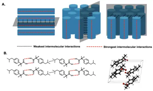 Typically, the strongest intermolecular interactions form the molecular layers or columns and the weakest intermolecular interactions form the slip plane.[27] For example, long chains or layers of acetaminophen molecules form due to the hydrogen bond donors and acceptors that flank the benzene ring. The weaker interactions between the chains or layers of acetaminophen required less energy to break than the hydrogen bonds. As a result, a slip plane is formed.