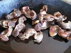 The cuisine of Gascony is characterised by the use of regional products such as duck fat and duck foie gras, salted ham, and the famous mild chilli of Gascony. Common condiments are Bezolles mustard, garlic, persillade, and onion. The cèpe mushroom is frequently eaten; Tricholoma equestre was traditionally eaten but is now considered poisonous after several cases of rhabdomyolysis were linked to its consumption. Larks and the common wood pigeon are commonly eaten game birds; the ortolan, previously commonly eaten, has been a protected species since 1999. Coastal seafood includes oysters, peppery furrowshells, eel elvers, lampreys, and shad.