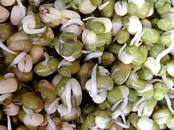 Along with green vegetables, another class of popular food is various beans, either whole or split. Split beans are called dal and turned into amti (thin lentil soup), or added to vegetables such as dudhi. Dal may be cooked with rice to make khichadi. Whole beans are cooked as is or more popularly soaked in water until sprouted. Unlike Chinese cuisine, the beans are allowed to grow for only a day or two. Curries made out of sprouted beans are called usal and form an important source of proteins.[41] The legumes popular in Maharastrian cuisine include peas, chick peas, mung, matki, urid, kidney bean, black-eyed peas, kulith[42] and toor (also called pigeon peas).[43] Out of the above toor and chick peas are staples.[5][44] The urid bean is the base for one of the most popular types of papadum[45]'.