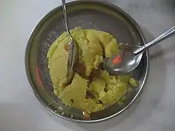 Peanut oil[46] and sunflower oil are the preferred cooking oils; however, cottonseed oil is also used.[47] Clarified butter (called ghee) is often used for its distinct flavor. It is served with puran poli, varan bhaat, chapati and many other dishes. Fresh homemade butter is usually served with bhakri.