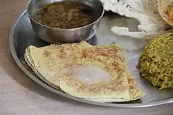 Wheat flatbreads are also made with vegetable stuffings such as peas, potatoes and gram dal.[17] One of the ancient sought-after breads was mande.[18] As with rice, flatbreads accompany a meal of vegetables or dairy items.