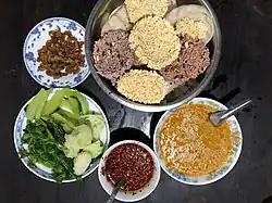 Myanmar is one of very few countries where tea is not only drunk but eaten as lahpet, pickled tea served with various accompaniments.[32][33] The practice of eating tea dates in modern-day Myanmar back to prehistoric antiquity, reflecting the legacy of indigenous tribes who pickled and fermented tea leaves inside bamboo tubes, bamboo baskets, plantain leaves and pots.[6] Tea leaves are traditionally cultivated by the Palaung people.[6] Pickled tea leaves continue to play an important role in Burmese culture today.[6] Ngapi (ငါးပိ), a fermented paste made from salted fish or shrimp, is considered the cornerstone of any Burmese traditional meal. It is used to season many soups, salads, curries and dishes, and condiments, imparting a rich umami flavor.[2] The ngapi of Rakhine State contains no or little salt, and uses marine fish. Meanwhile, ngapi made with freshwater fish is common in Ayeyarwady and Tanintharyi regions. Ngapi yay (ငါးပိရည်) is an essential part of Karen and Bamar cuisine, in which a sauce dip of ngapi cooked in various vegetables and spices is served with blanched and fresh vegetables, similar to Thai nam phrik, Indonesian lalab, and Malay ulam. Pickled fish, called ngachin, is also used in Burmese cooking.