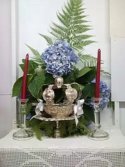 Also, referred to as the cortège, império or mudança (English: the move); on Easter day, the crowns are transported to the church, where they are placed on the altar, until the end, when they ceremonially crown the recipient (coronation). The emperor will then depart for his home, accompanied by his cortège and the brotherhood, and led by the Holy Spirit's standard, the foliões, the crowns surrounded by the poles (in a rectangular form) and trailed by the faithful. Normally, a band will follow the cortège with cheerful processional music, although they may be accompanied alone by the Foliões of the Divino. Upon arriving at the emperor's home, the crowns are placed on an altar of honour of wood and adorned with white paper and flowers, to remain throughout the week. Every evening the neighbours and faith community gather at the home where traditionally some food and dancing may have occurred, but usually ends with the recitation of the rosary and benedictions to the Holy Spirit. On the following Sunday, the crowns depart once again with the cortège for the church, where they are received by the local parish priest, who recites the Magnificat (a traditional pastoral benediction). The process, traditionally, repeats itself until the seventh Sunday following Easter (referred to as the Domingo do Bodo), and in some cases until the eighth Sunday following Easter (traditionally referred to as the Segundo Bodo or Domingo da Trindade).[9] The modern tradition, influenced by religious immigrants, is shortened to include a brief cortège procession (usually on the same day of the coronation), and ceremonial transfers of the crown to the home of the emperor, all performed throughout the summer.[10]
