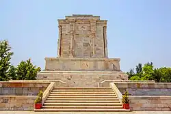 In addition to historic gates, palaces, bridges, buildings, and religious sites that highlight the highly developed supremacy of the Iranian art of architecture, gardens are also an example of cosmic symbolism and unique style of combining intensity and simplicity for form immediacy.[53][55] There are currently 14 Iranian gardens that are listed as UNESCO World Heritage Sites, with 5 of them being located outside of Iran.[58] The traditional style of Iranian gardens is to represent an earthly paradise or a heaven on Earth. From the time of the Achaemenid Empire, the idea of an earthly paradise spread through Iranian literature to other cultures, with the word for paradise in the Iranian languages of Avestan, Old Persian, and Median, spreading to languages across the world.[59] The style and design of the Iranian garden greatly influenced the garden styles of countries from Spain to Italy and Greece to India, with some notable examples of such gardens being the gardens of the Alhambra in Spain, Humayun's Tomb, and the Taj Mahal in India, the Hellenistic gardens of the Seleucid Empire and the Ptolemies in Alexandria.[59]
