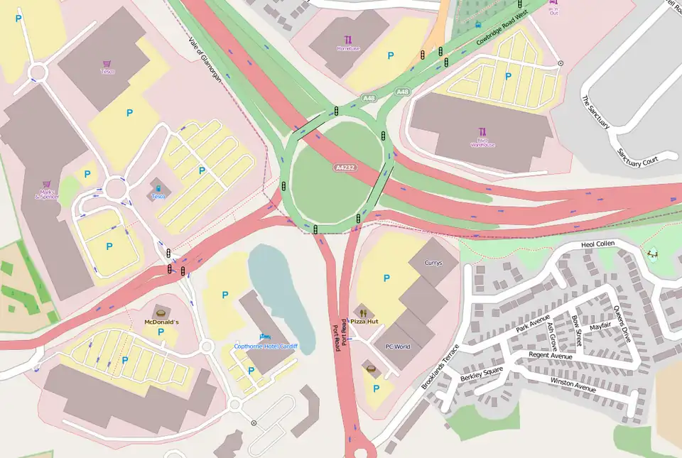 The district is centred on a major traffic roundabout that links West Cardiff to the M4 motorway and is home to a number of different retail outlets, and formerly ITV Wales's headquarters.
